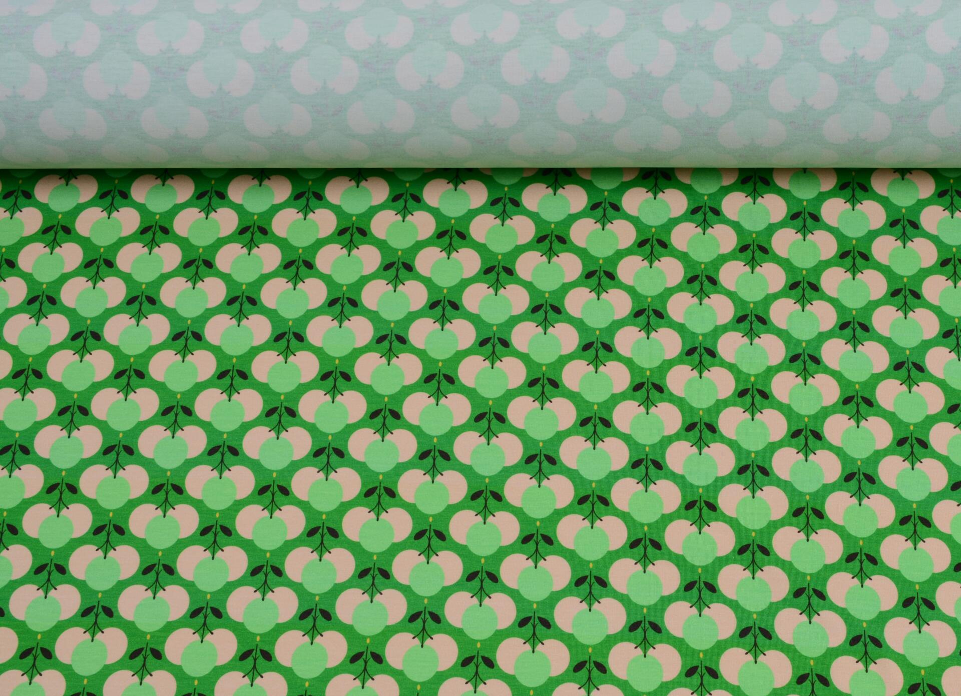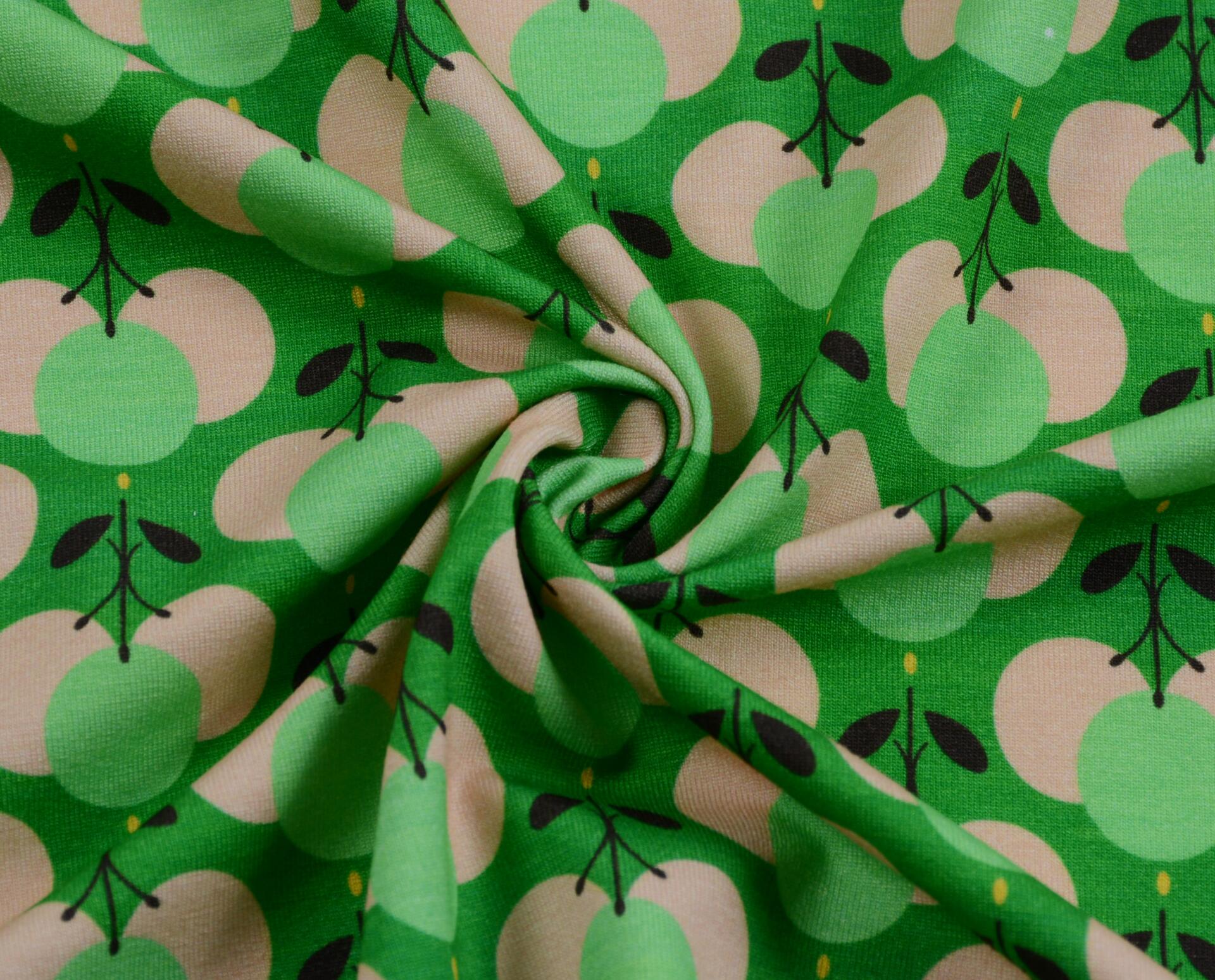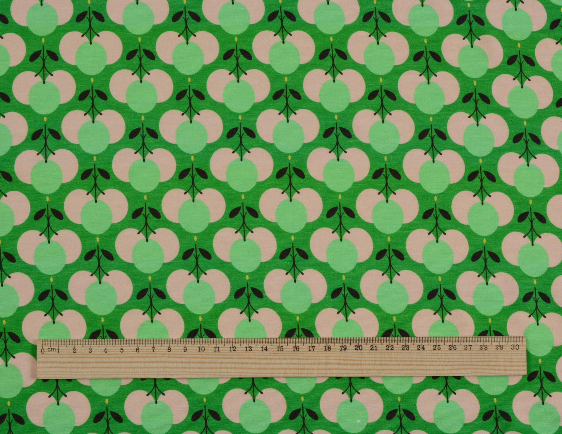 Dzianina Wiskozowa Owocowe Wzory na Zielonym Tle