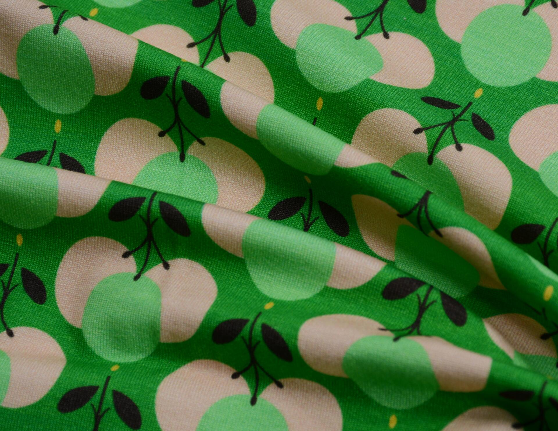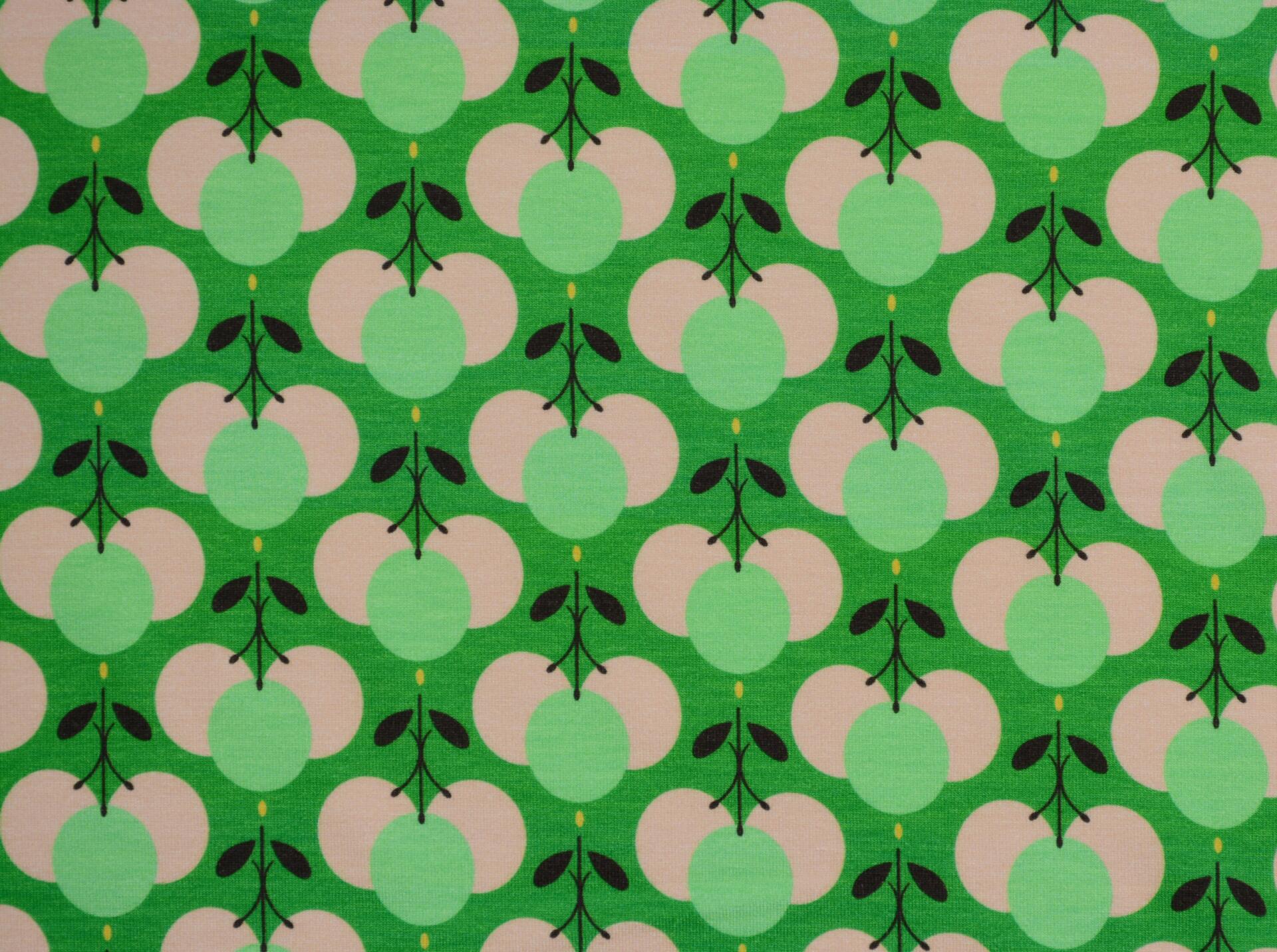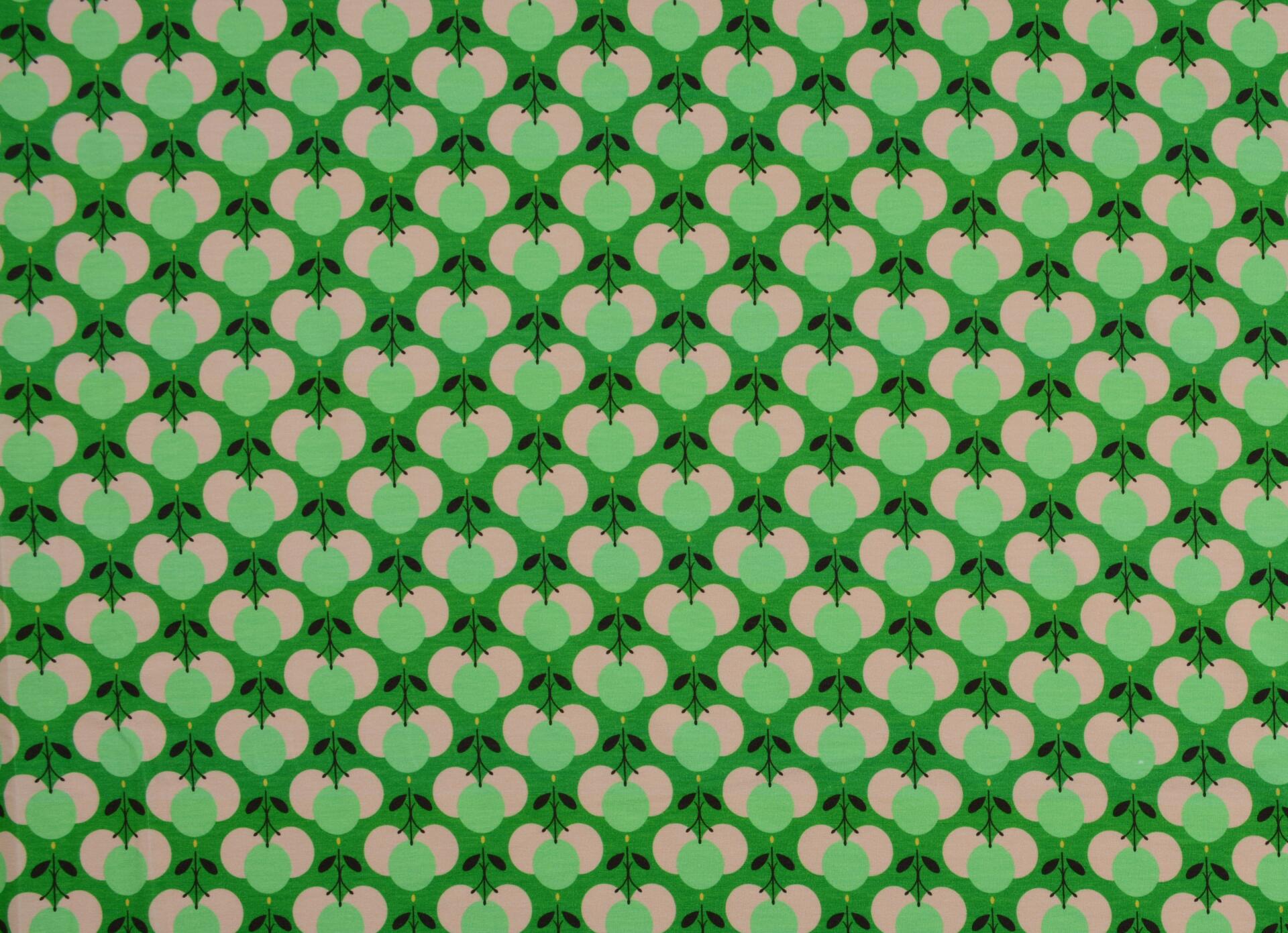 Dzianina Wiskozowa Owocowe Wzory na Zielonym Tle