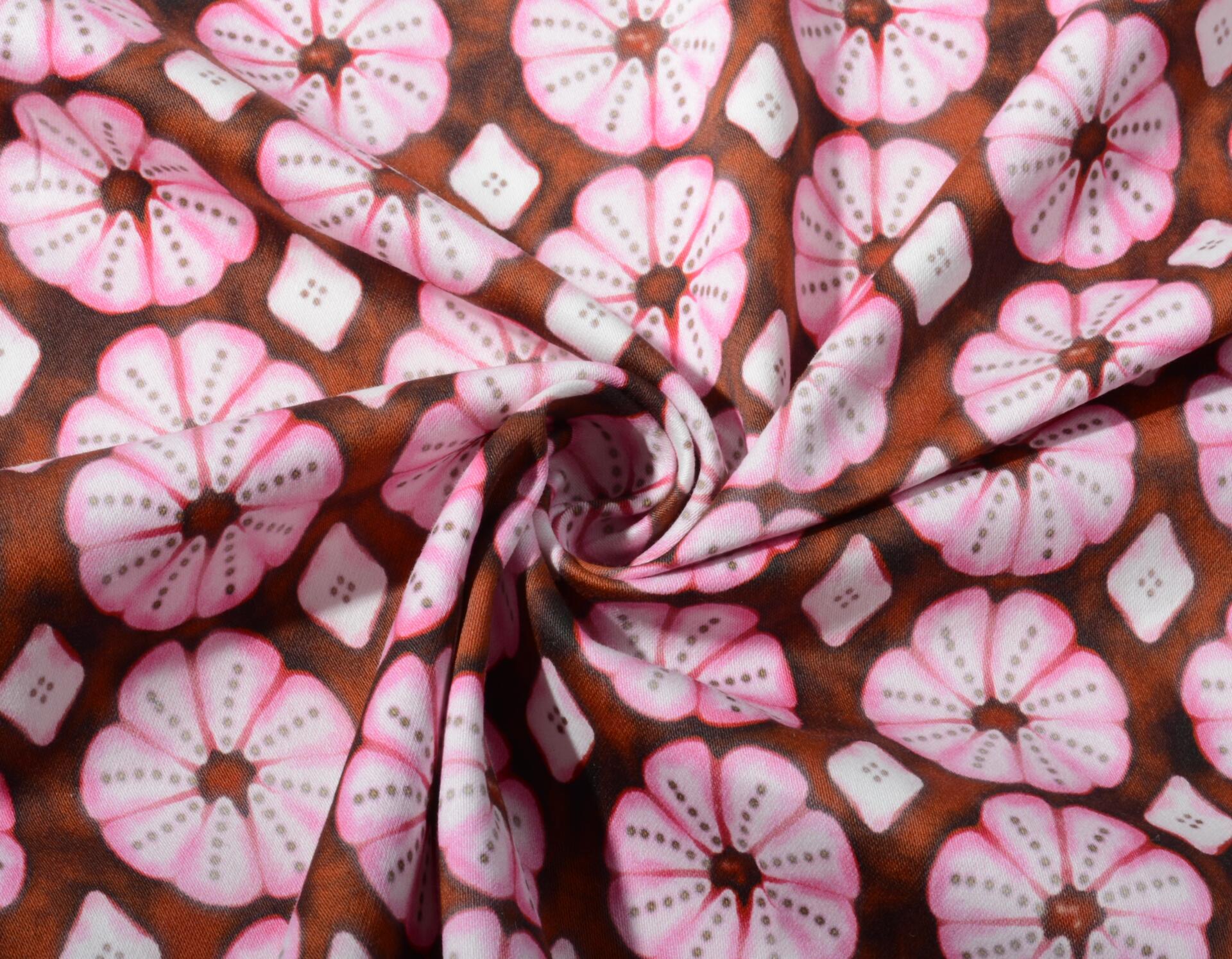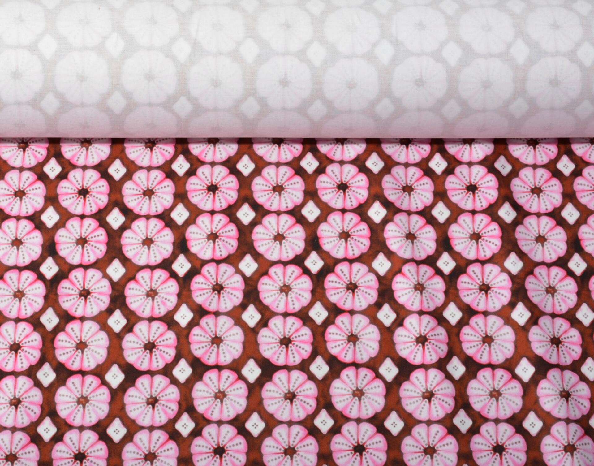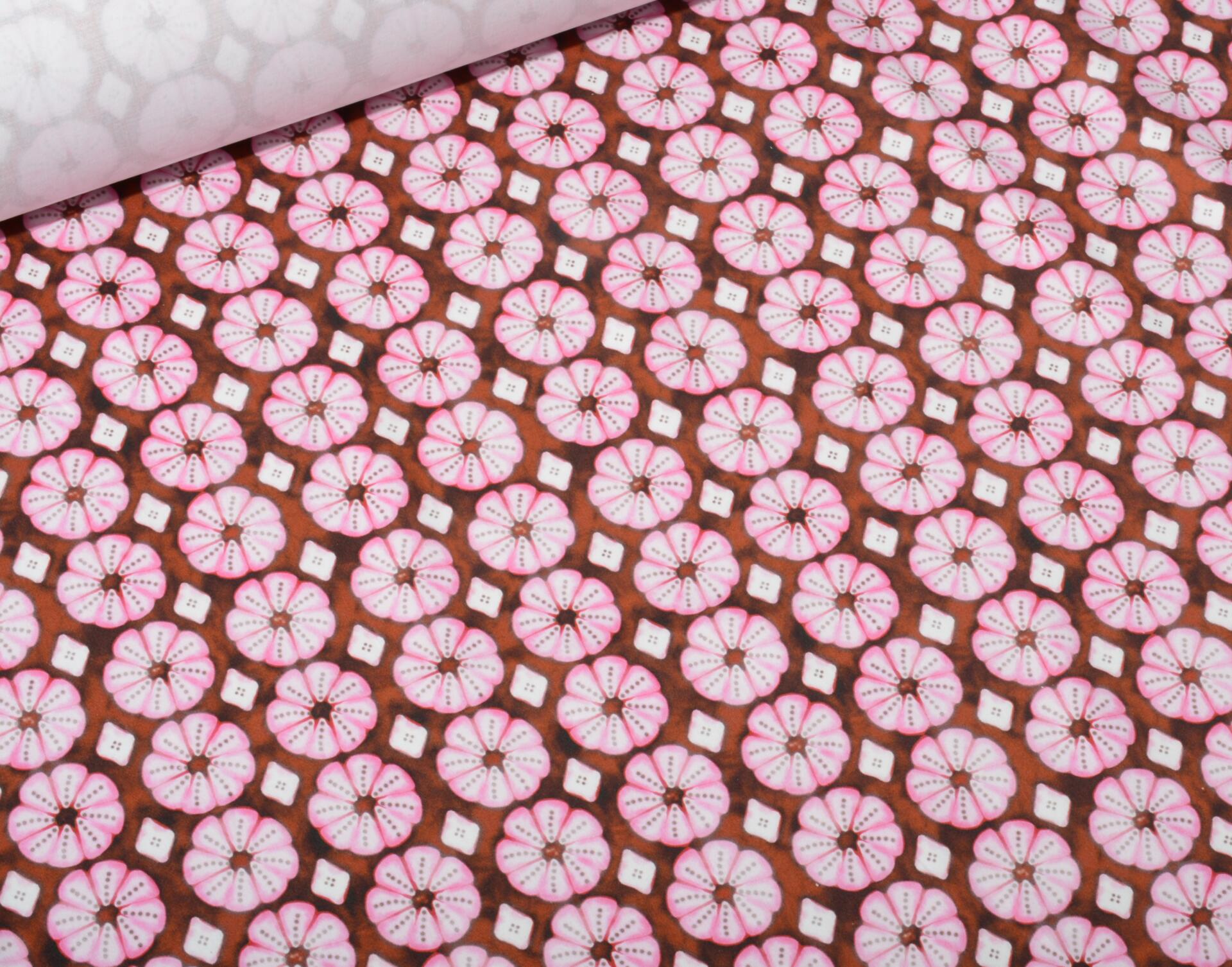 Tkanina Bawełniana Różowe Kwiaty na Brązowym Tle